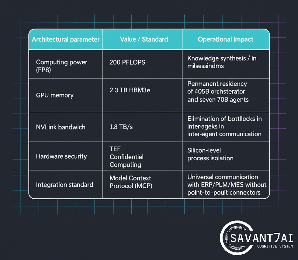 The NVIDIA HGX B300 (Blackwell Ultra) architecture delivers 200 PFLOPS of computing power in FP8 mode – performance that allows knowledge synthesis to be generated in milliseconds instead of seconds. The system has a total of 2.3 TB of VRAM (HBM3e), enabling it to handle models with 405 billion parameters at full numerical precision without degrading quantization quality. NVLink interprocess bandwidth reaches 1.8 TB/s, eliminating bottlenecks in multi-agent orchestration processes. This specification is not an abstract technical value – it translates directly into the ability of the Enterprise Cognitive System (ECS) to perform real-time inference processes. In practice, it means that SAVANT-AI can execute thousands of concurrent, fully grounded queries from engineers, risk officers, or procurement teams, while keeping response times in the low‑millisecond range for each user.
